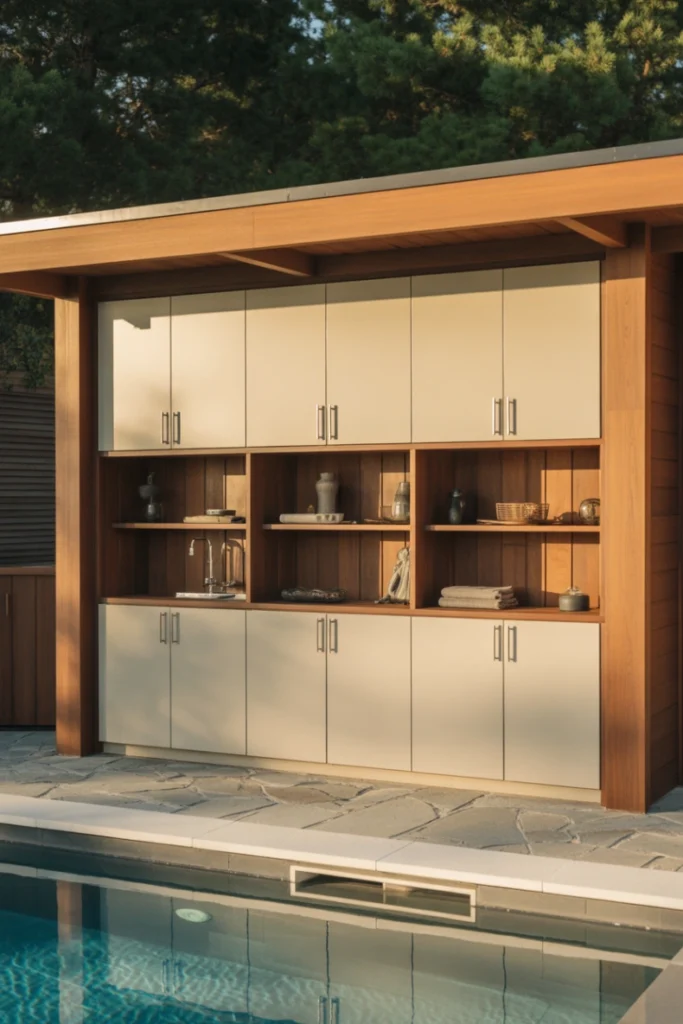 A pool pavilion with built-in storage is one of the most practical pool pavilion ideas. Cabinets, benches with hidden compartments, or storage walls keep pool accessories organized and out of sight.