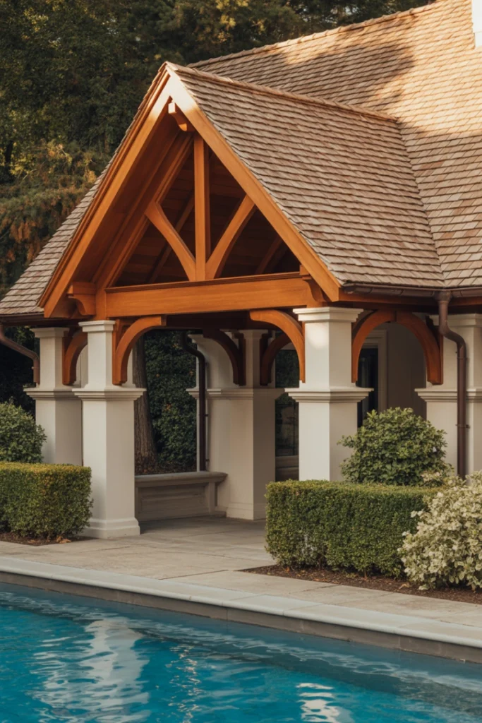 Traditional pool pavilion ideas feature pitched roofs, symmetrical layouts, and classic materials. This style complements traditional homes and landscaped gardens, offering a timeless and elegant appearance.
