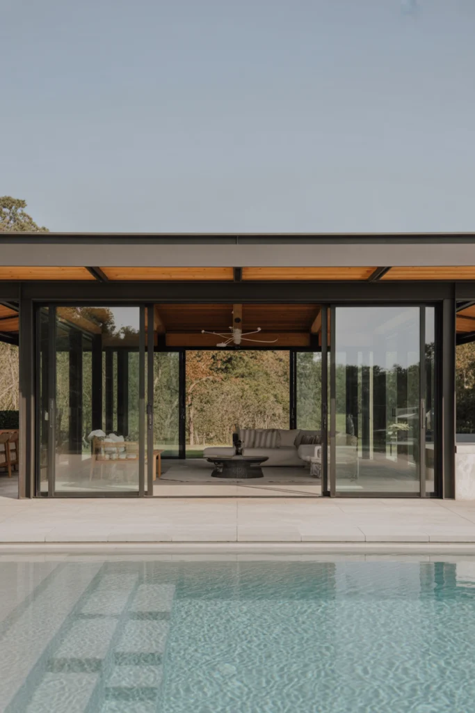An enclosed pool pavilion offers maximum protection and year-round usability, making it one of the most practical pool pavilion ideas. Glass walls, sliding doors, or retractable panels allow the space to be fully enclosed or opened as needed. This flexibility provides shelter from wind, rain, and cooler temperatures without sacrificing views.