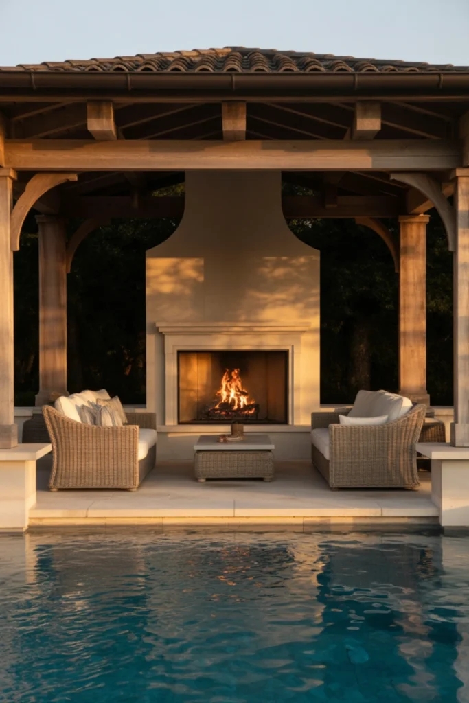 Adding a fireplace introduces warmth and ambiance, making this one of the most luxurious pool pavilion ideas. A fireplace creates a strong focal point and allows the pavilion to be used during evenings and cooler months. Whether wood-burning or gas, fire adds visual interest and a sense of comfort.