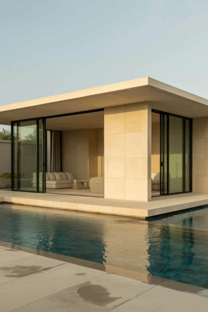 A flat-roof pool pavilion is a strong architectural statement and one of the most popular pool pavilion ideas for contemporary homes. Clean lines, sharp angles, and minimal detailing define this style, giving the outdoor space a sleek and sophisticated appearance. The flat roof creates a bold horizontal element that contrasts beautifully with water and landscaping.
