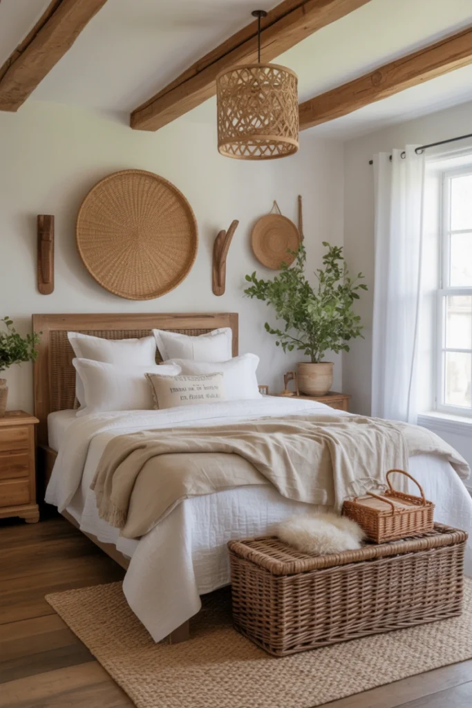 Enhance the look with linen bedding, earthy tones, and soft lighting. Rattan furniture is both durable and stylish, making it ideal for rustic interiors that value comfort and natural beauty. This rustic bedroom idea blends farmhouse charm with boho warmth.