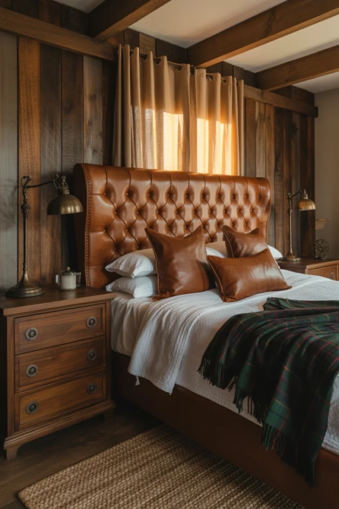 To balance the look, mix leather with soft textiles and light colors. Warm lighting highlights leather’s natural tones and grain patterns. This rustic bedroom idea is perfect for anyone seeking a combination of comfort and masculine style.