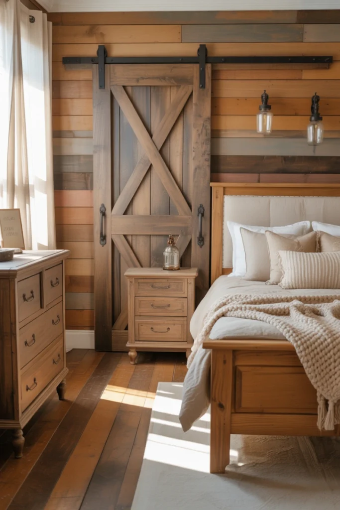 Sliding barn doors instantly add rustic charm and functionality to a bedroom. These doors save space while introducing a farmhouse-style design element that is both charming and practical. Barn doors can be stained, painted, or distressed to match the room’s aesthetic. Their bold presence serves as a focal point and enhances the overall rustic atmosphere.