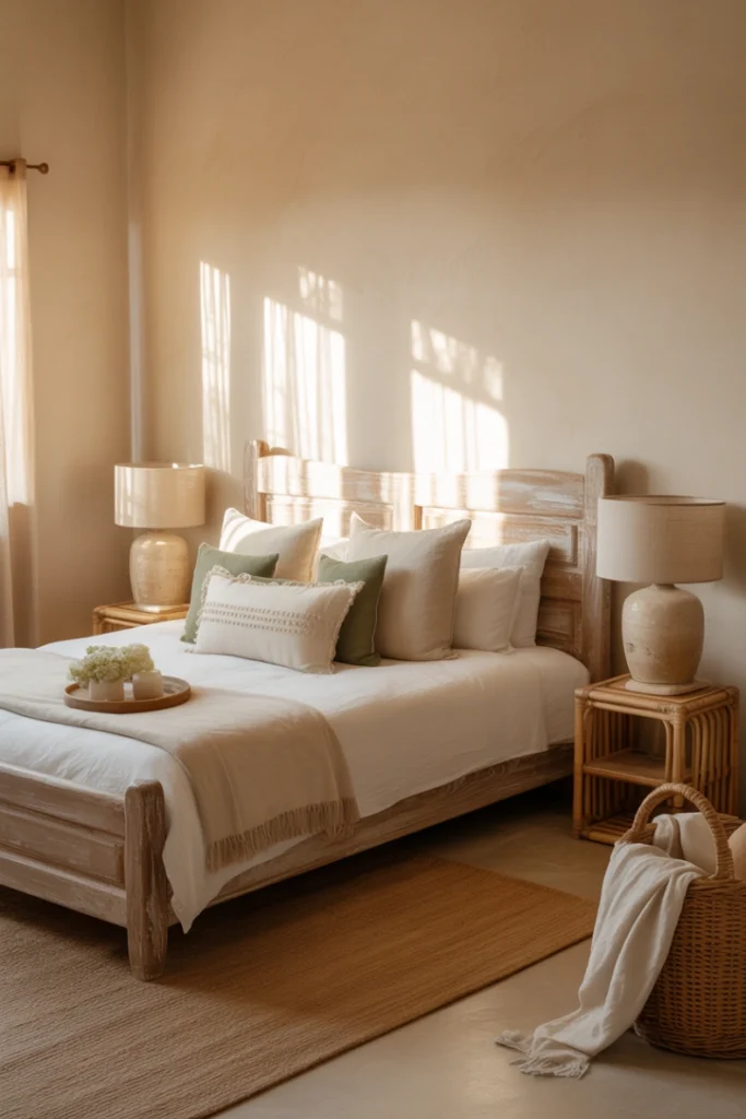 Enhance the aesthetic with linen bedding, wooden frames, and earthy tones. Mixing woven textures with other natural materials keeps the room balanced and visually appealing. This rustic bedroom idea is perfect for nature lovers who enjoy organic and earthy designs.