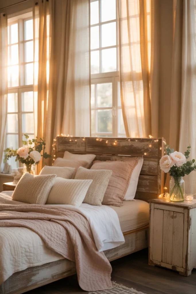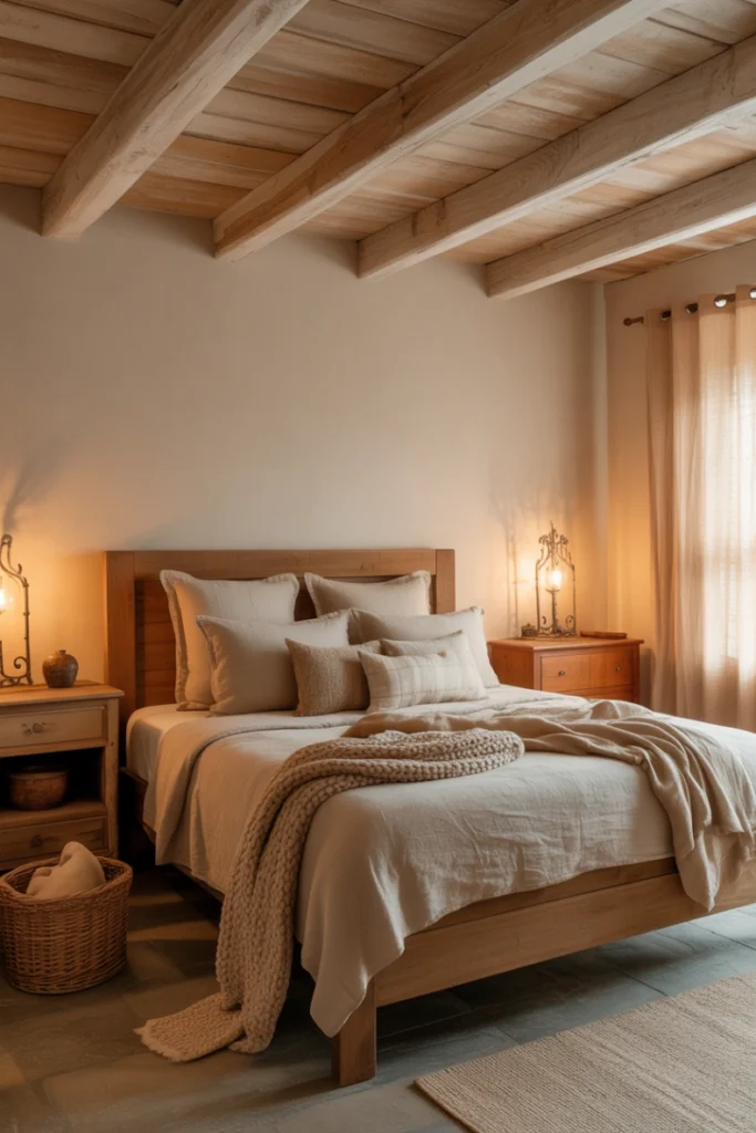 To enhance the romance, add candles, layered bedding, and decorative throws. Soft neutrals paired with warm woods create harmony and comfort. This rustic bedroom idea is perfect for creating a restful and romantic sanctuary.