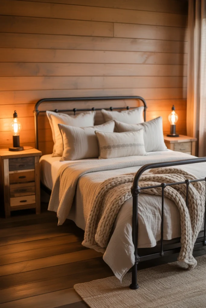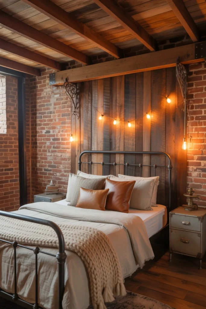 Enhance the style with Edison-style lighting, metal bed frames, and leather accents. Add cozy textiles and natural rugs to bring warmth and balance. This rustic bedroom idea merges rugged industrial elements with the inviting comfort of rustic charm, creating a bold and memorable space.