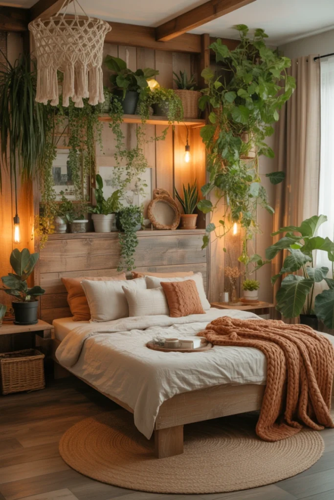 For a balanced look, combine large leafy plants with small tabletop greenery. Wooden planters or ceramic pots blend seamlessly with rustic interiors. This rustic bedroom idea is perfect for nature lovers who want to bring the outdoors in.