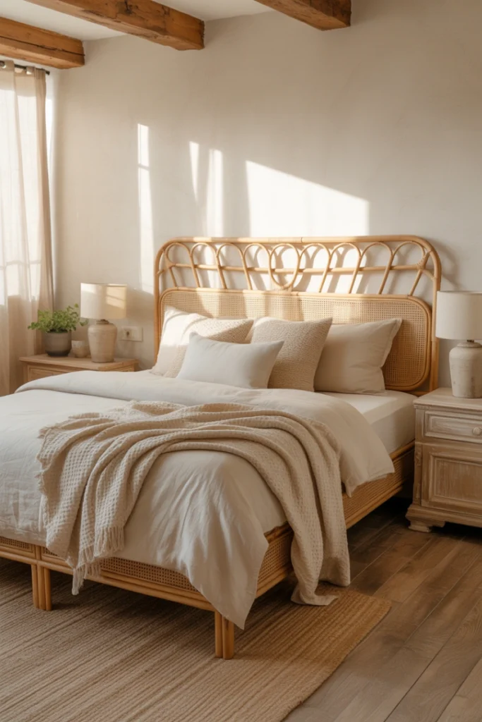 Rattan and caned furniture bring coastal warmth and natural texture into rustic bedrooms. These materials create a relaxed, airy feel that pairs beautifully with organic décor. Caned headboards, woven nightstands, or rattan chairs introduce unique craftsmanship while maintaining rustic appeal. Their natural tones complement neutral color palettes perfectly.