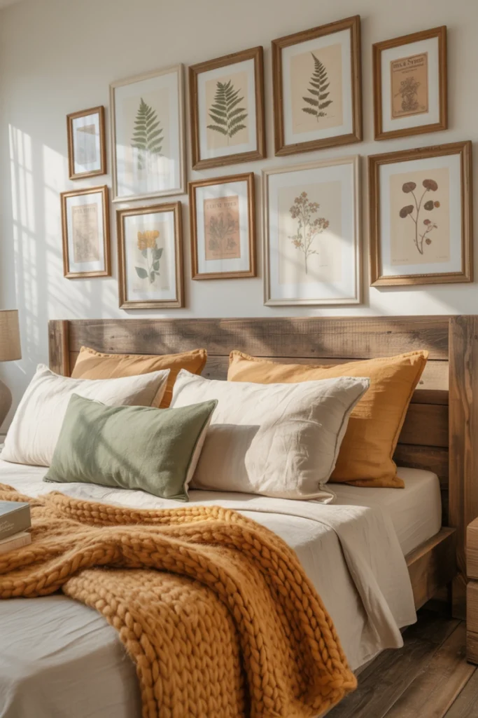 To enhance the aesthetic, create a gallery wall featuring natural textures and soft colors. Wooden frames, woven décor, or macramé pieces add variety. This rustic bedroom idea suits homeowners who appreciate artistic accents and personalized touches in their décor.