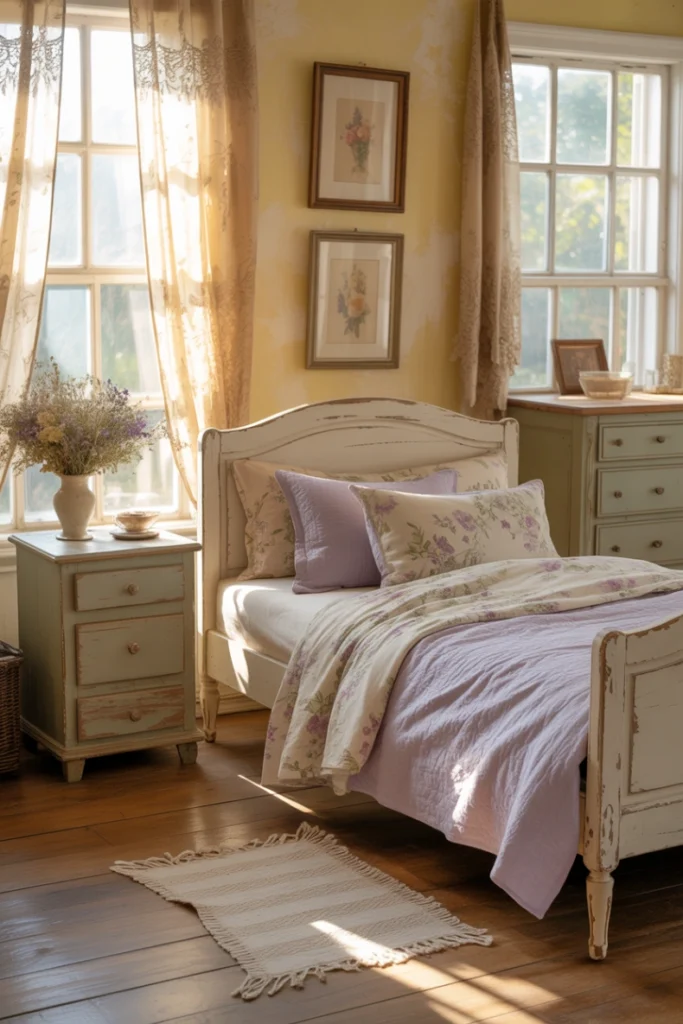 To complete the look, incorporate cotton quilts, layered bedding, and antique décor pieces such as lanterns or old framed art. Rustic metal fixtures and woven baskets add texture without overwhelming the soft and welcoming atmosphere. This farmhouse style balances comfort and charm, making your bedroom feel like a retreat into simpler times.