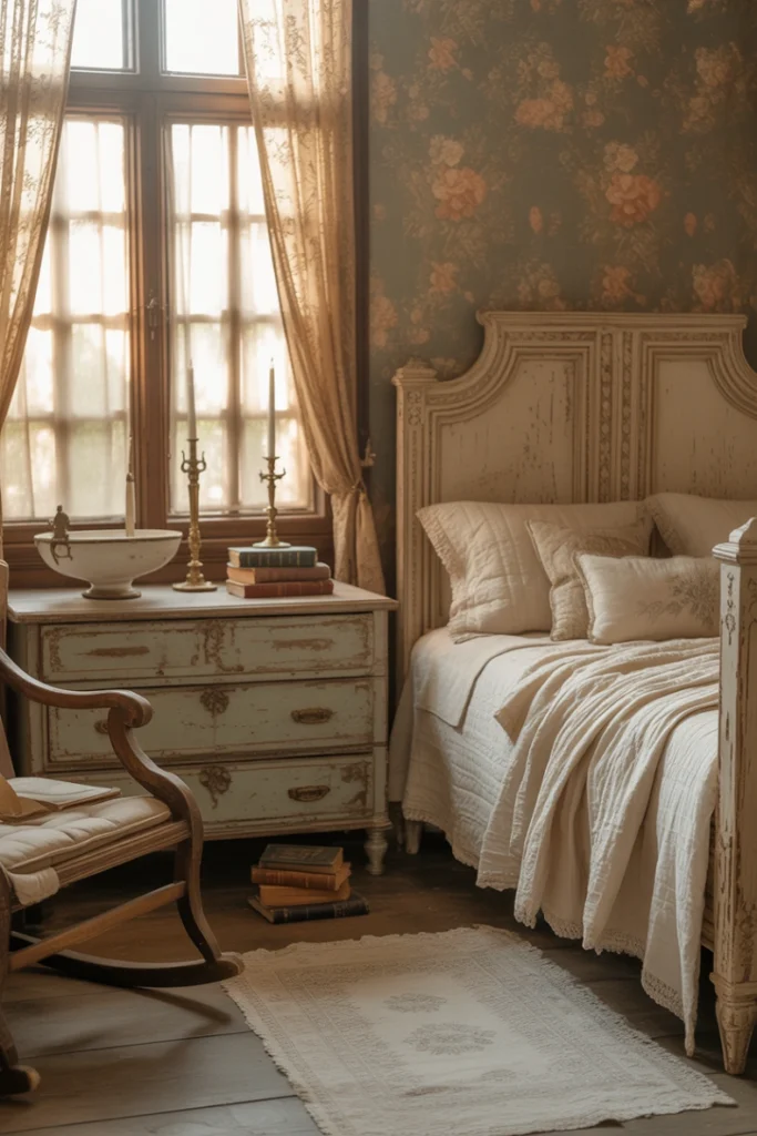 To elevate the cottage vibe, use lace curtains, quilts, and painted wooden dressers. Soft colors such as cream, light blue, or sage green enhance the peaceful, lived-in aesthetic. This rustic bedroom idea is ideal for creating a gentle, romantic retreat that feels warm and timeless.