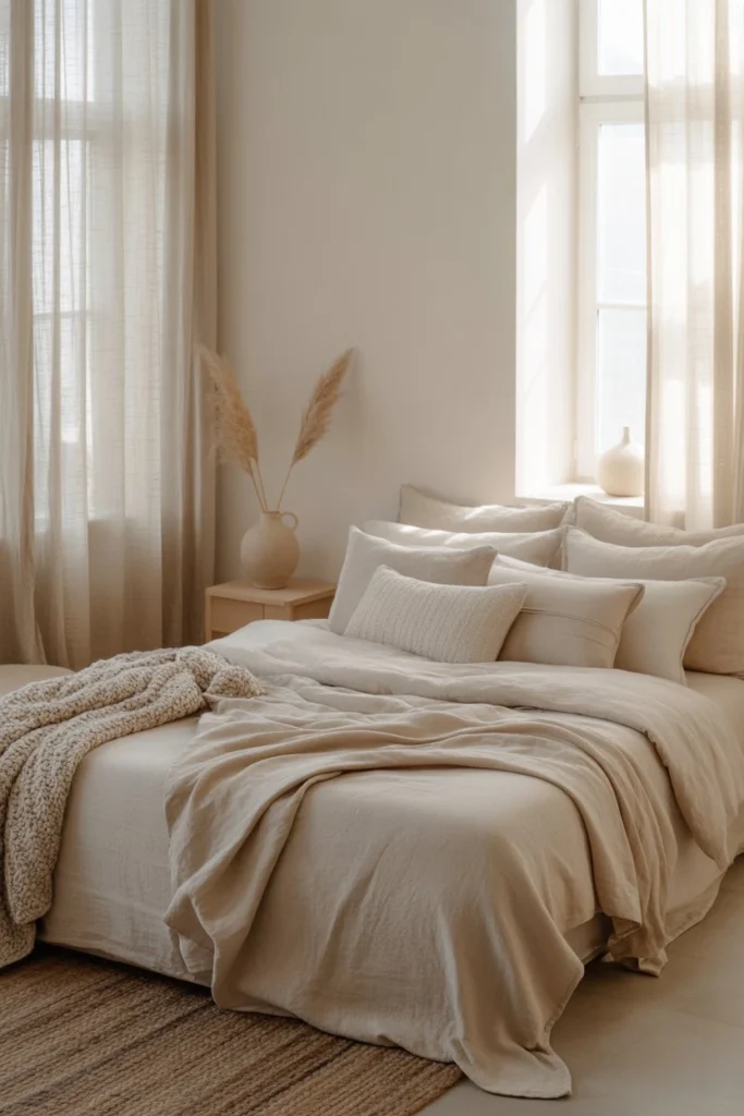 Add texture with cozy fabrics, a woven rug, or linen bedding to prevent the room from feeling flat.