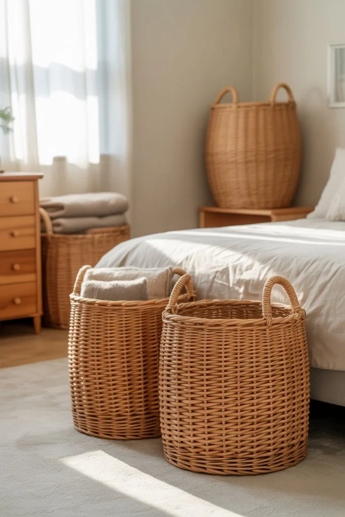 Stylish baskets are a simple way to organize clothes, blankets, and accessories while adding texture.