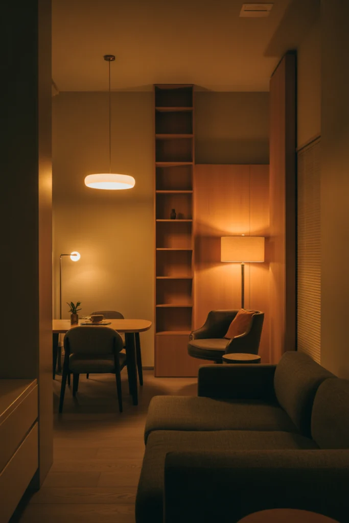 Lighting is one of the easiest ways to make a small room feel bigger and more inviting. Instead of relying on a single ceiling fixture, layer your lighting with a mix of floor lamps, wall sconces, and table lamps. This approach creates depth and warmth.