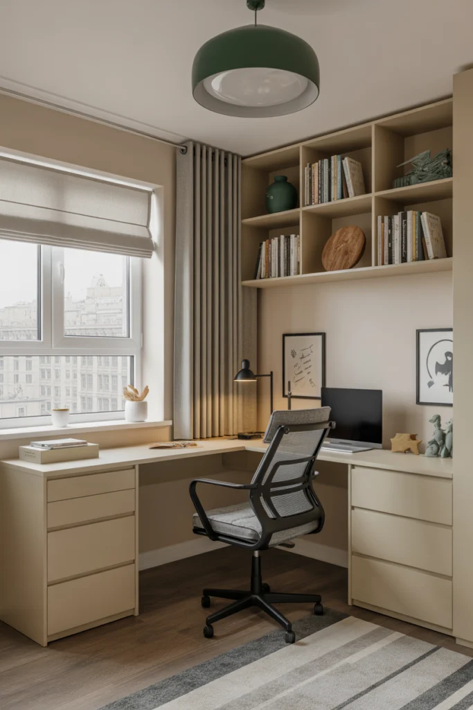 A study-focused bedroom prioritizes concentration and productivity. This design includes ergonomic desks, task lighting, and organized storage systems. Among practical Teen Boys Bedroom Ideas, this approach supports academic success while maintaining comfort.