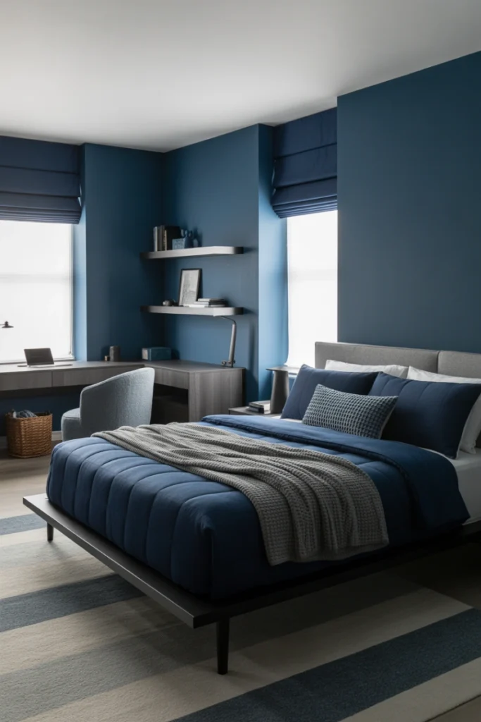 Navy blue and gray create a calm yet masculine color palette. This combination is popular among Teen Boys Bedroom Ideas for its versatility and mature feel. It works well with modern and traditional furniture styles.