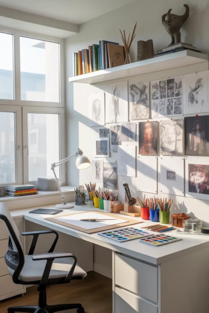 Storage for art supplies, natural lighting, and flexible furniture support creativity without clutter. Displaying artwork personalizes the room and builds confidence. This design evolves easily as artistic interests grow.