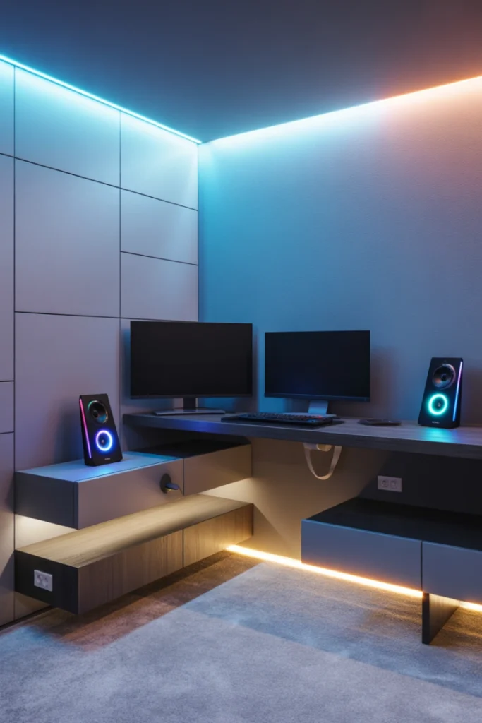 Gaming-inspired bedrooms are one of the most requested Teen Boys Bedroom Ideas today. These rooms focus on immersive experiences, featuring LED lighting, ergonomic gaming chairs, and desks designed to support multiple monitors and consoles. Darker color palettes enhance the gaming atmosphere while reducing screen glare.