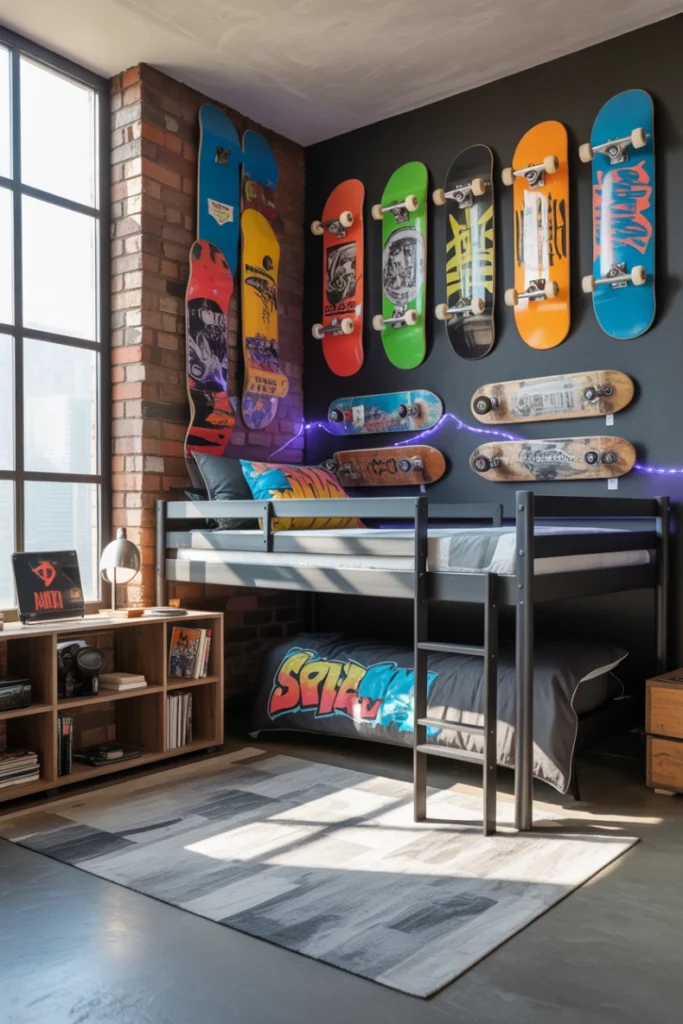 Skateboard-inspired bedrooms reflect an active, adventurous lifestyle. Deck displays, urban textures, and bold graphics define this style. It’s one of the most energetic Teen Boys Bedroom Ideas.