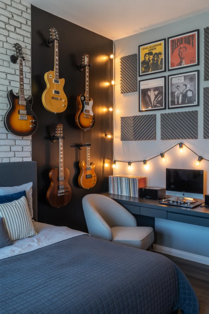 For teens passionate about music, a music-themed bedroom creates a creative and inspiring environment. Wall-mounted guitars, framed album covers, and soundproof panels enhance both style and functionality. This is one of the most expressive Teen Boys Bedroom Ideas, allowing individuality to shine.