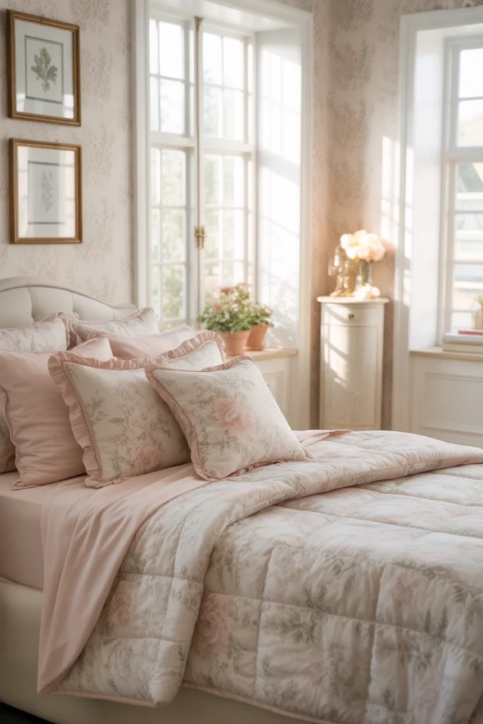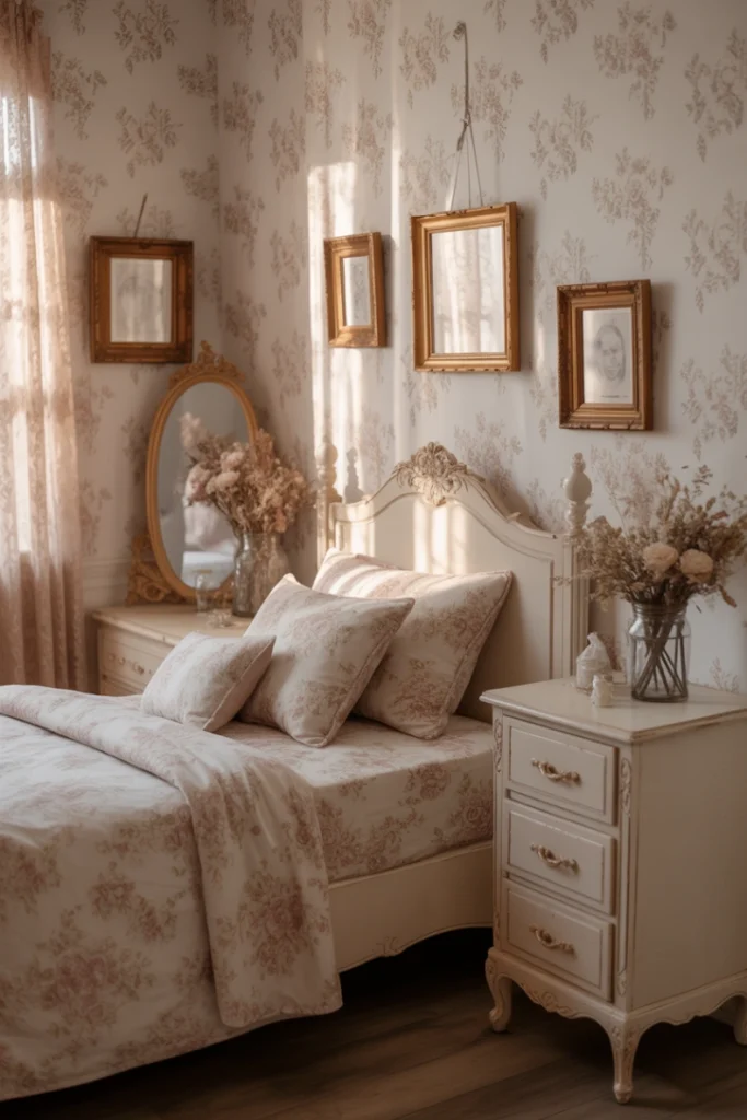 Pair vintage pieces with modern comforts to keep the room functional. Delicate lighting and textured fabrics enhance the romantic feel. This idea creates a bedroom that feels warm, personal, and timeless.