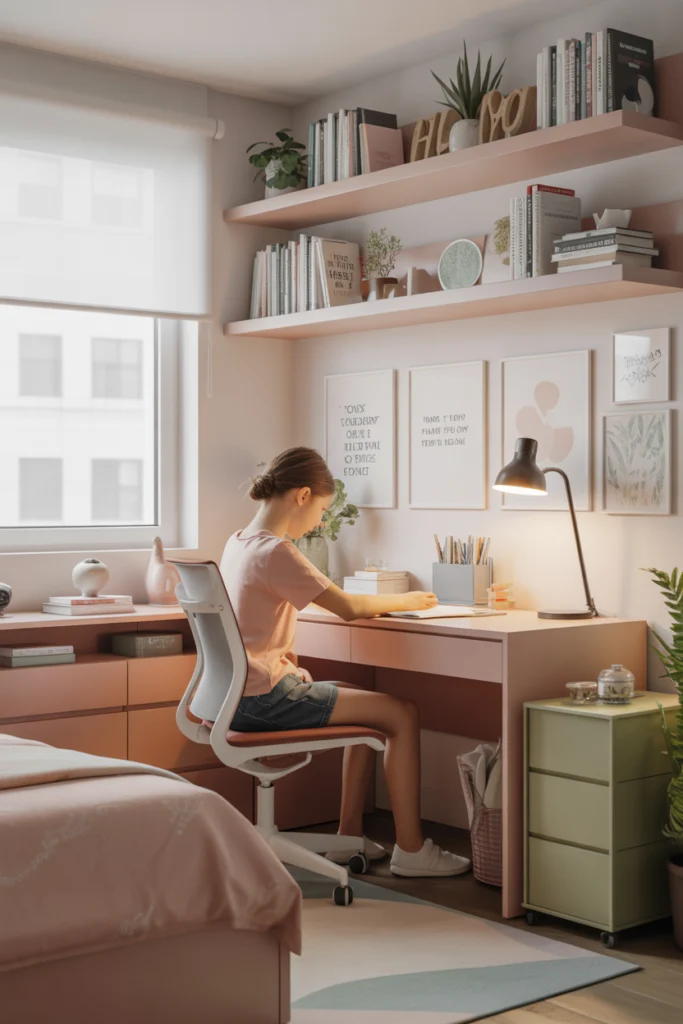 Comfortable seating, task lighting, and organized storage improve focus. Keeping the study area visually appealing helps maintain motivation. This teen girls bedroom idea supports both learning and relaxation.