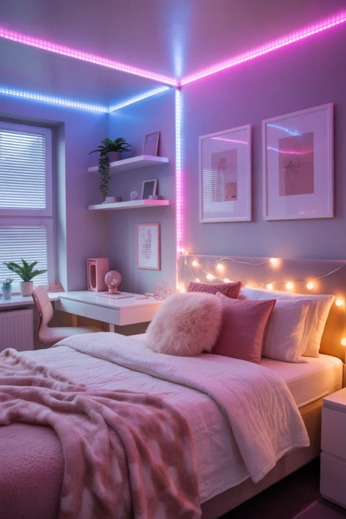 Used thoughtfully, LED lights enhance ambiance without overwhelming the room. Pair with neutral decor for balance. This teen girls bedroom idea feels youthful and customizable.