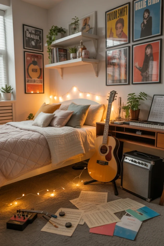 A music-inspired bedroom reflects passion and creativity. Posters, instruments, and themed decor personalize the space. This idea is ideal for teens who love music.