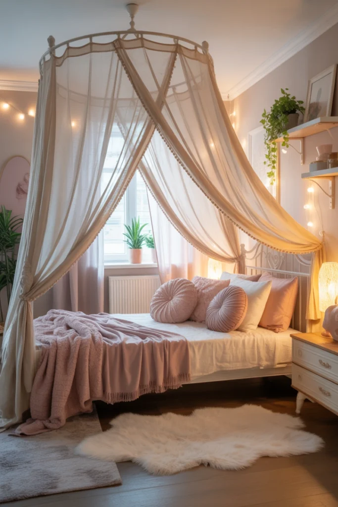 A canopy bed creates a dreamy focal point. Sheer curtains add softness and privacy. This idea transforms a bedroom into a relaxing retreat.