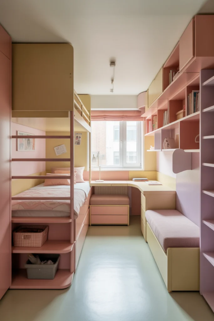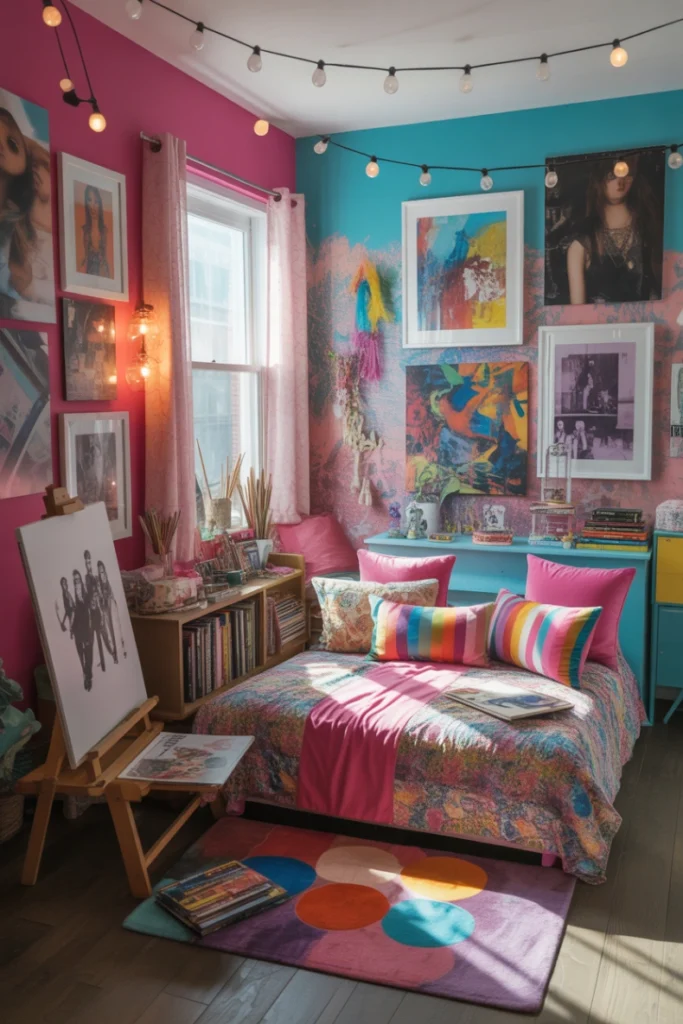 Sound-friendly layouts and organized displays keep the room functional. This teen girls bedroom idea feels energetic and expressive.