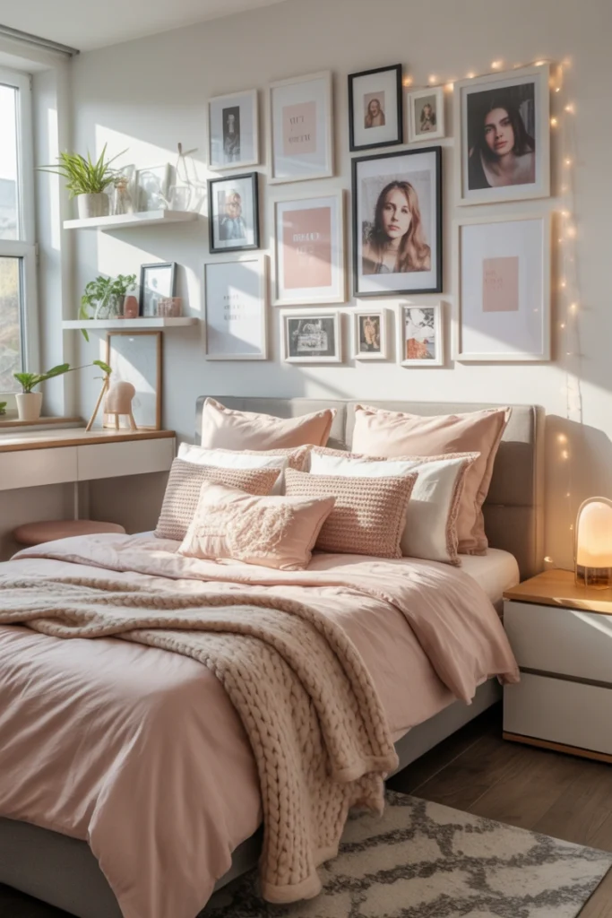 A personalized gallery wall showcases memories, art, and inspiration. It makes the bedroom feel truly personal and meaningful.