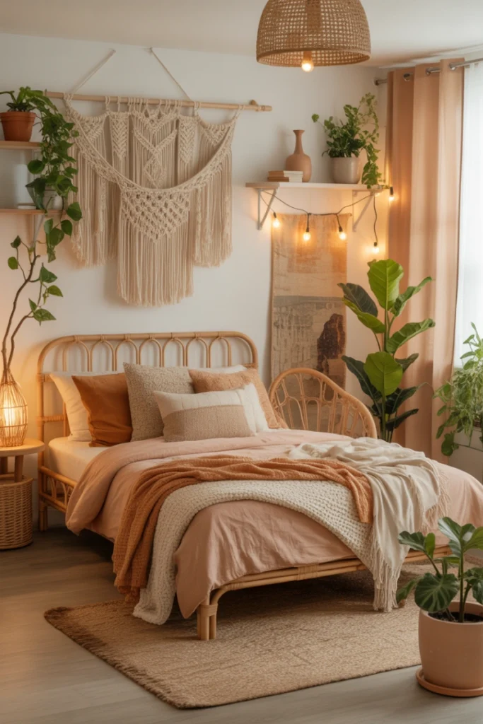 Natural materials such as rattan, wood, and linen work beautifully in a boho bedroom. Low beds, floor cushions, and cozy throws encourage relaxation and comfort. Plants play a key role in this style, bringing life and freshness to the space. This teen girls bedroom idea creates a cozy retreat that feels personal, artistic, and effortlessly stylish.