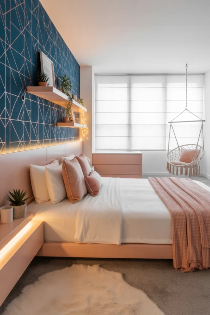 An accent wall is an easy way to add character and drama to a teen girl’s bedroom. Whether it’s a bold paint color, geometric wallpaper, or a mural, an accent wall instantly becomes the focal point of the room. This approach allows teens to express their personality without committing to a full room makeover. Popular choices include floral patterns, abstract designs, or inspirational quotes.