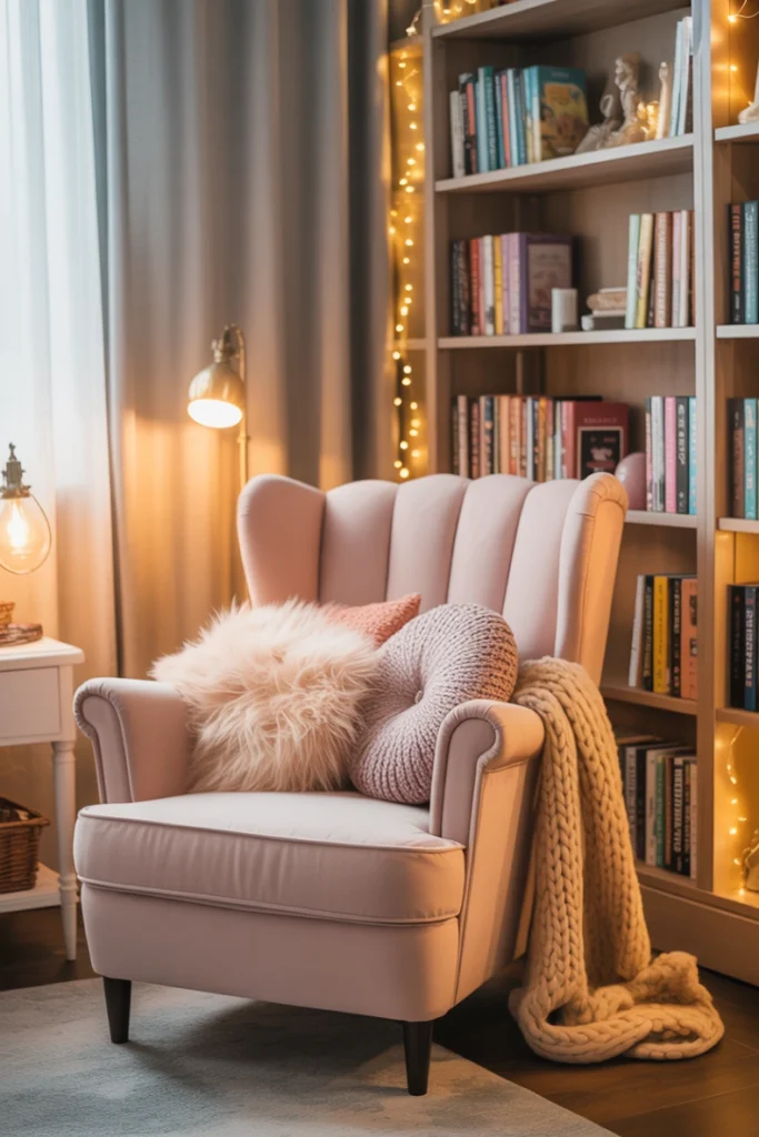 Enhance the nook with throw blankets, decorative pillows, and a small bookshelf. Natural light near a window works best, but a warm floor lamp can also create an inviting ambiance. This idea is perfect for teens who love books and quiet moments, making their bedroom feel more purposeful and cozy.