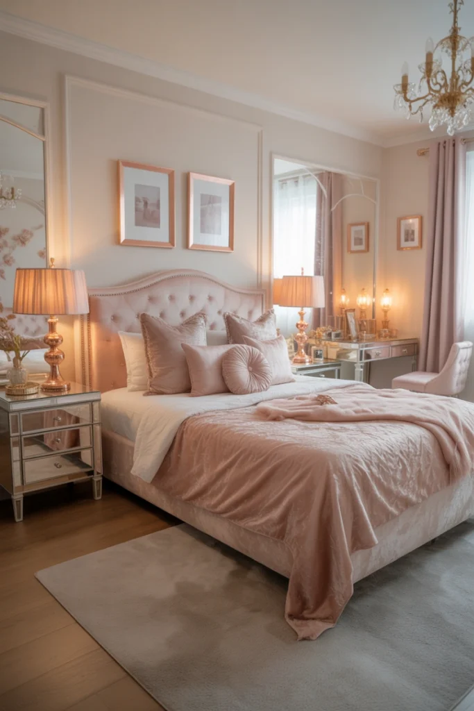 A glam chic bedroom appeals to teen girls who love elegance and sparkle. This style features luxurious textures, glossy finishes, and metallic accents. Think velvet headboards, mirrored furniture, and crystal-style lighting that add a touch of sophistication. Soft color palettes like blush, cream, or gray keep the room refined rather than overwhelming.
