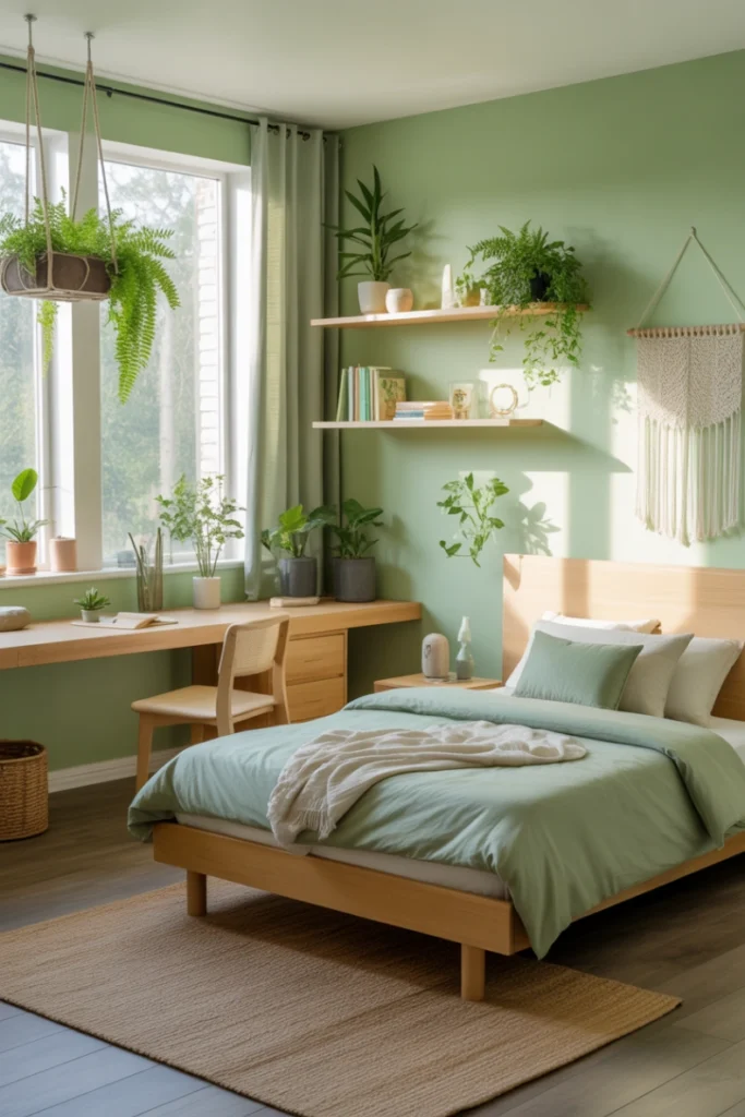 A nature-inspired bedroom brings a sense of calm and freshness to a teen girl’s space. Shades of green paired with natural materials create a soothing environment that promotes relaxation. This style works well for teens who enjoy a peaceful, grounded aesthetic.