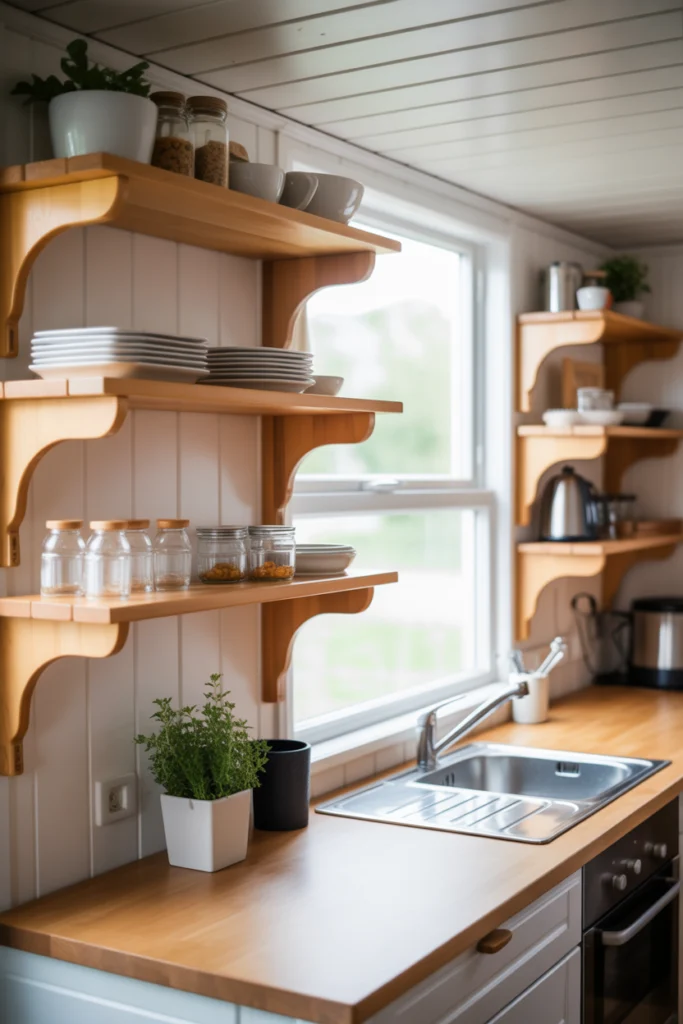 Open shelving is one of the most popular Tiny House Kitchen Ideas because it makes small kitchens feel more spacious. Removing upper cabinets reduces visual bulk and creates an airy, open environment. Shelves allow quick access to everyday items and offer a chance to display your prettiest dishes or glassware. The absence of cabinet doors also increases usable depth and keeps items visible, reducing the need to dig through cluttered cupboards.