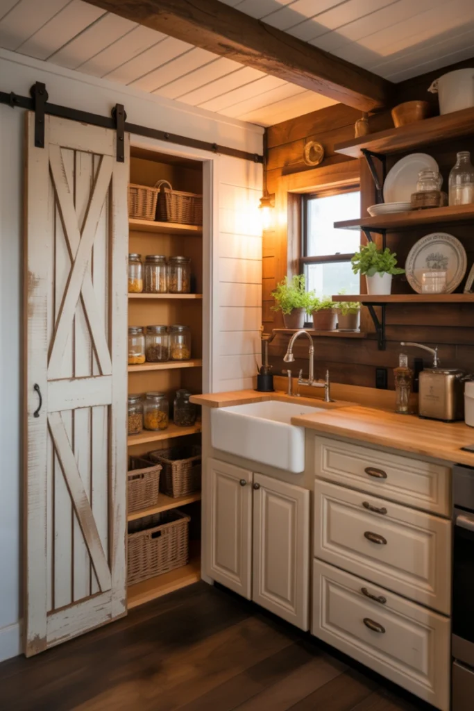 Sliding barn doors are practical space-saving solutions for closing off walk-in pantries or appliance areas without taking up floor space. These doors slide along the wall, making them ideal for tiny kitchens where every inch counts. Barn doors also add character and charm, especially in rustic or modern farmhouse tiny homes.
