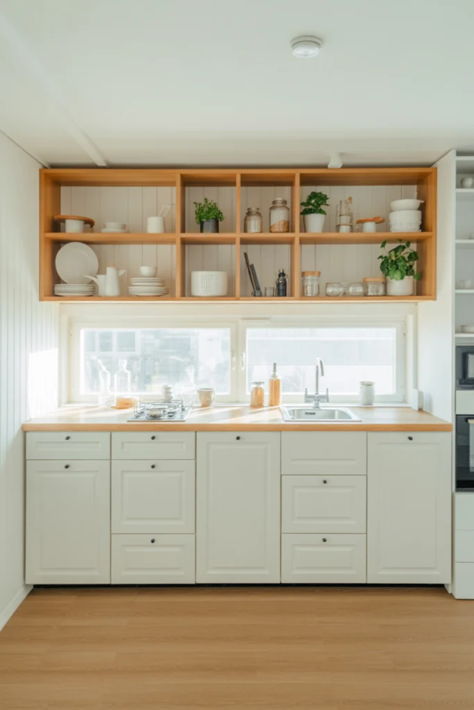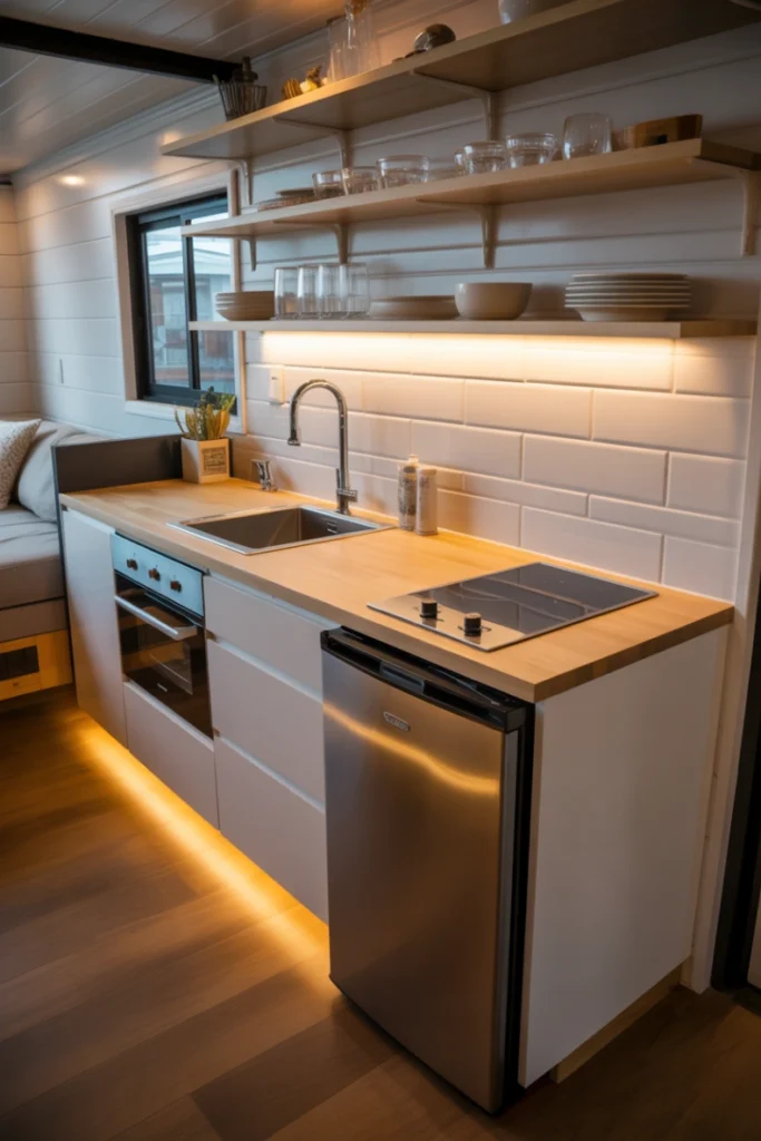 Choose slim lower cabinets and open shelves to maintain visual openness. Use compact appliances to avoid overcrowding. This Tiny House Kitchen Idea enhances workflow and makes cooking enjoyable even in very limited spaces.