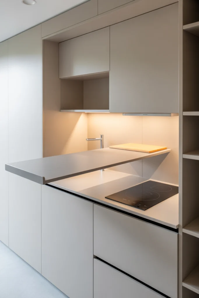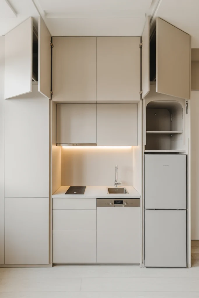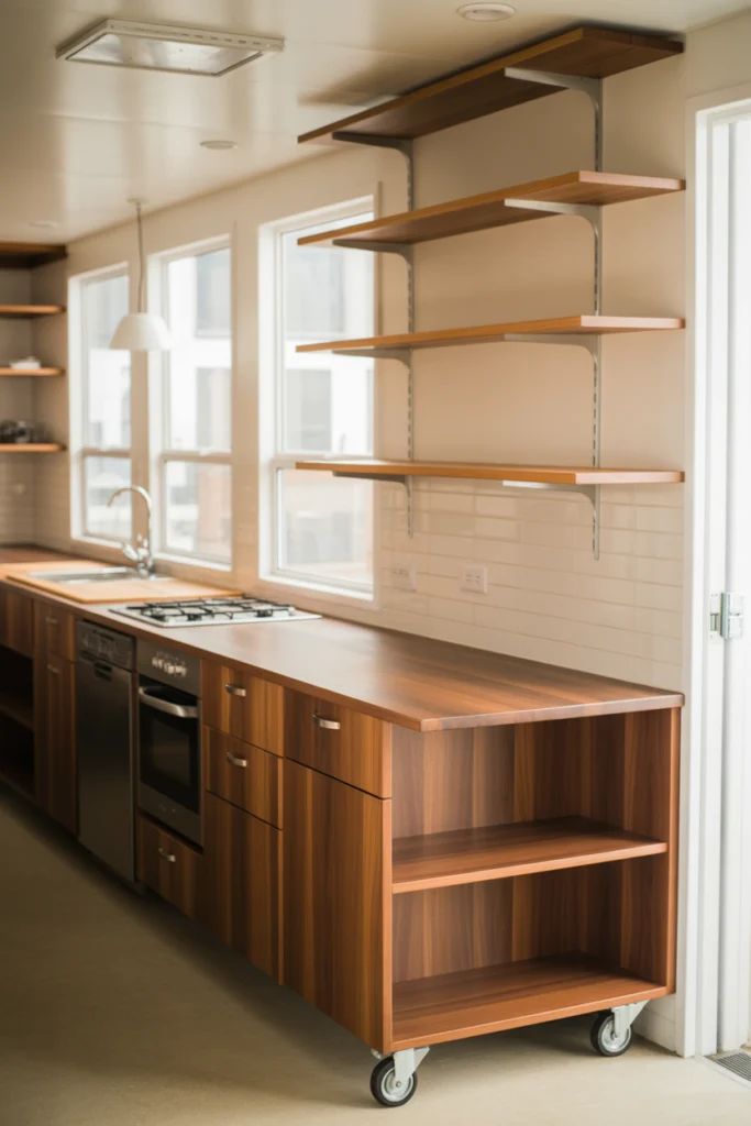 Fold-away walls allow you to open or close the kitchen depending on your needs. When open, the space feels larger and flows into the living area. When closed, the kitchen disappears—ideal for tiny homes where visual simplicity is essential. Folding panels or accordion-style doors create flexible boundaries.