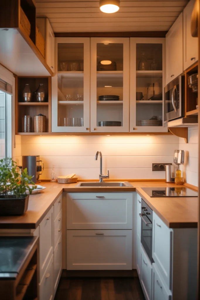 Pair with soft lighting inside the cabinets to enhance visual depth. Use matching dish sets or storage containers to maintain a cohesive appearance. This Tiny House Kitchen Idea combines beauty with spaciousness, making small kitchens feel more open and inviting.