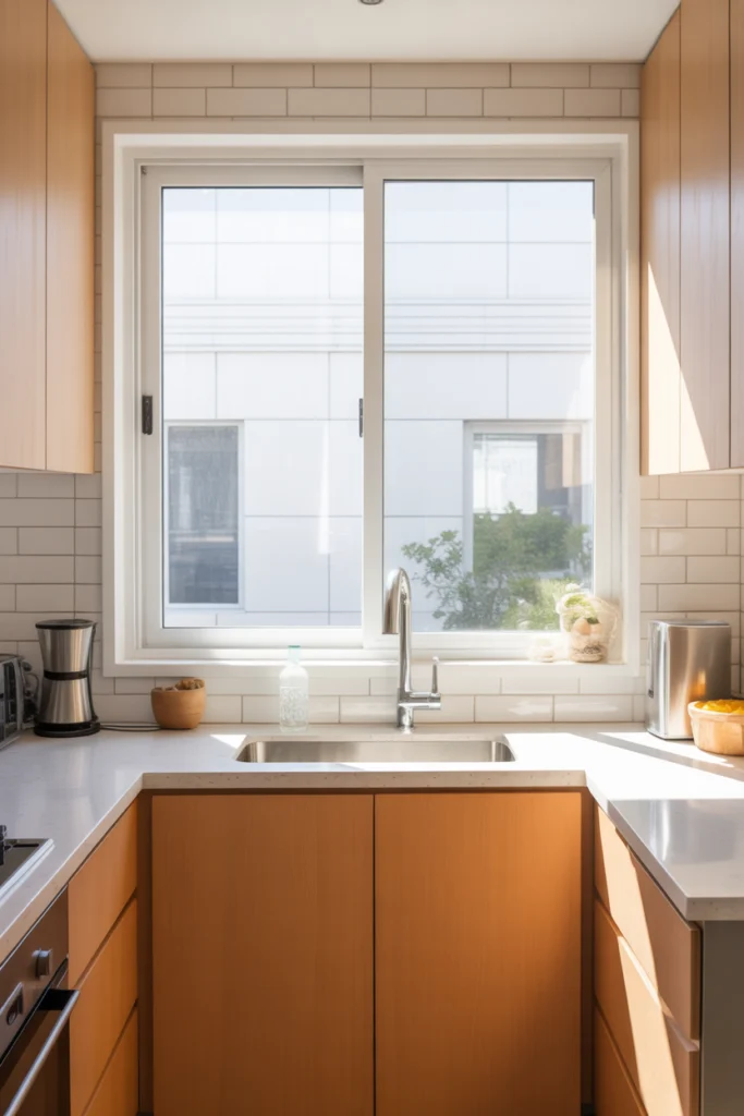 Sliding windows improve ventilation and allow natural light to flood tiny kitchens. Natural light makes compact areas feel brighter and more spacious. A well-placed sliding window can also act as a pass-through for outdoor dining, extending your kitchen’s functional footprint.