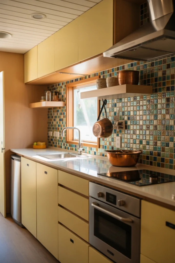 Use geometric, floral, or abstract patterns depending on your aesthetic. Pair with simple cabinetry to ensure the design feels harmonious. This Tiny House Kitchen Idea transforms compact kitchens into artistic and vibrant spaces.
