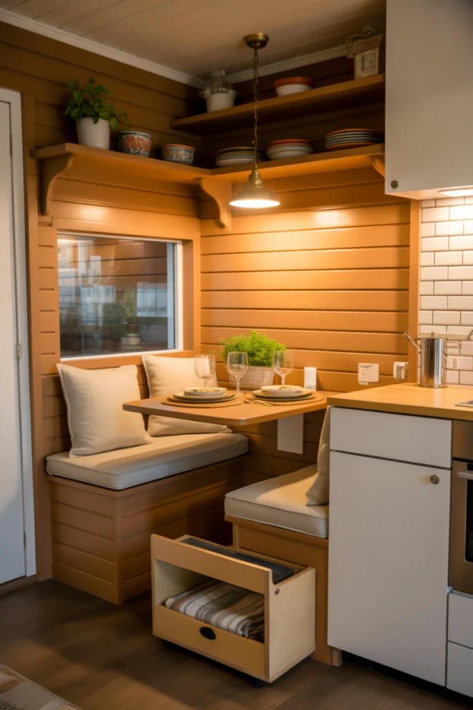 Customize the seating with cushions, pillows, and soft fabrics. Position the nook near a window if possible for natural lighting. This Tiny House Kitchen Idea blends comfort and functionality while conserving space.