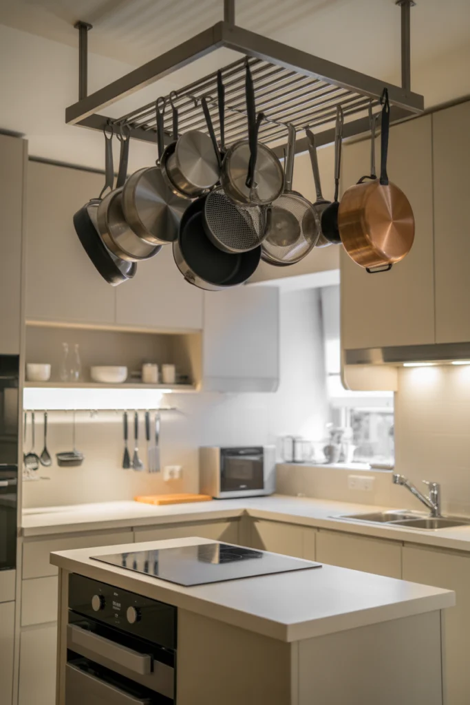 Ceiling-mounted racks or hanging bars offer excellent storage for pots, pans, and utensils. They free up cabinet and drawer space, making them ideal for tiny kitchens. This Tiny House Kitchen Idea also adds a professional, curated look to the space.