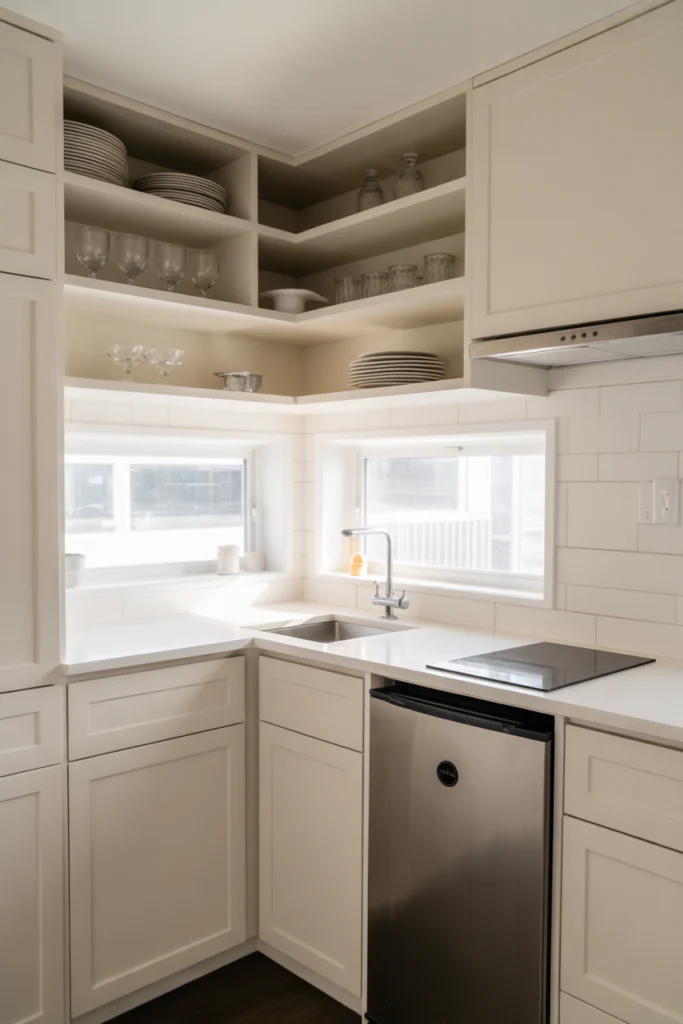 Enhance this layout with vertical storage systems, floating shelves, and corner cabinets to make full use of tight spaces. Slim appliances and minimalistic cabinetry help maintain a clean, open appearance. Add lighting beneath upper cabinets to enhance visibility and expand the visual feel of the room. This Tiny House Kitchen Idea ensures good function while maintaining a stylish and open effect.
