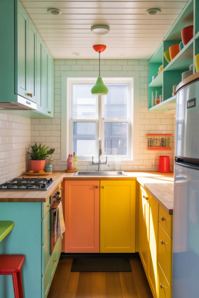 Color-pop cabinets bring cheerful personality into tiny kitchens. Bright hues like teal, mustard yellow, or coral create vibrant visual interest without requiring additional space. Color helps define the kitchen area in open tiny homes and prevents the space from feeling monotonous.