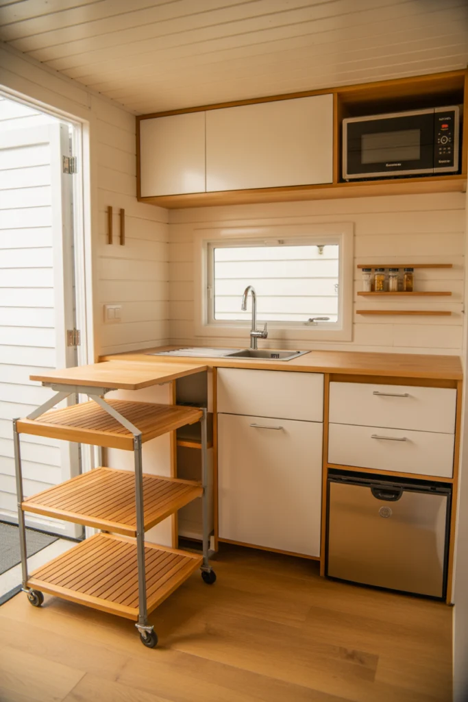 A portable kitchen island is a game-changer in tiny homes. It can function as extra prep space, a dining area, or additional storage. The fact that it’s movable means you can reconfigure your kitchen depending on daily needs. This flexibility is one of the strongest Tiny House Kitchen Ideas for maximizing limited square footage.