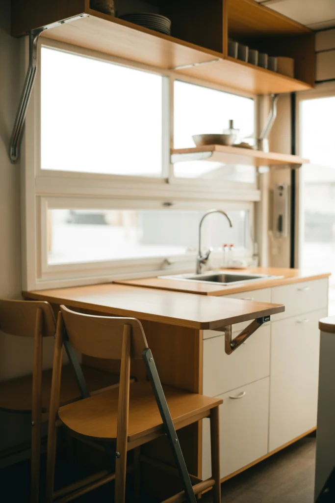 Use durable materials like butcher block or stainless steel for longevity. Consider adding fold-down stools or chairs that tuck away neatly when not needed. Installed near windows or under floating shelves, fold-down tables enhance utility while maintaining a clean, open feel. This Tiny House Kitchen Idea is ideal for multi-functional living.